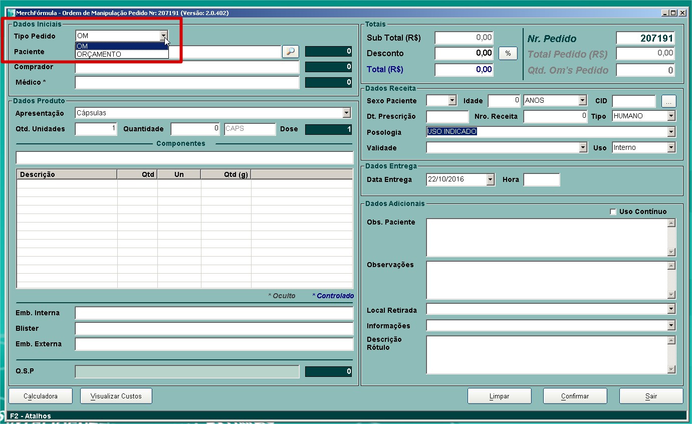 Foi criada uma configuração em: Ferramentas/Configurações/Gerais/Ordem de Manipulação, foi criada uma configuração para que a farmácia determine o padrão que deseja na abertura da tela. Se a farmácia tem um padrão de sempre fazer um orçamento e posteriormente uma OM pode configurar para sempre vir o padrão de orçamento, se a farmácia já faz a OM diretamente e usa os orçamentos esporadicamente pode configurar a opção OM. Lembrando que essa configuração serve somente como um padrão de abertura da tela, é possível alterar entre OM e Orçamento quando o operador desejar.