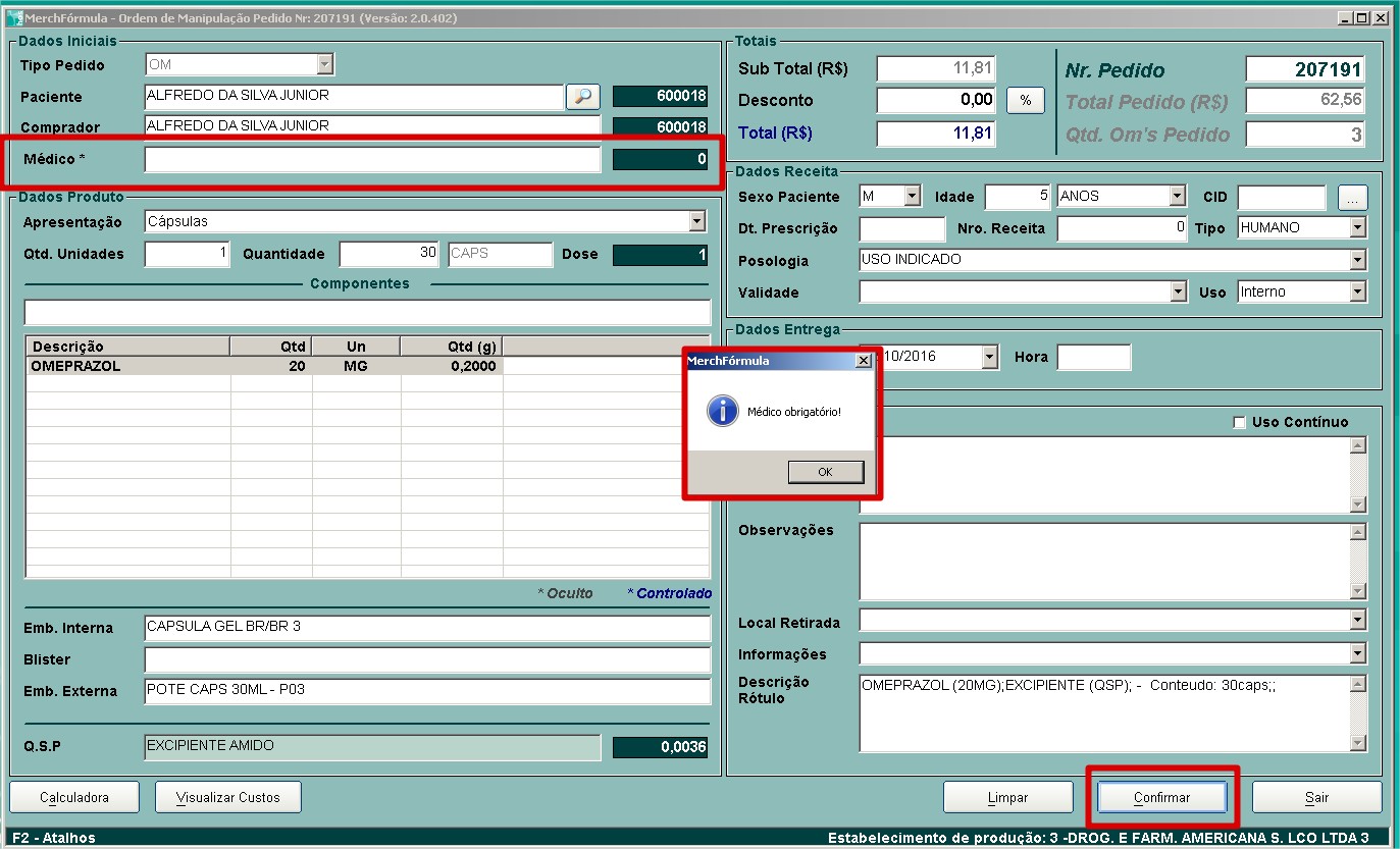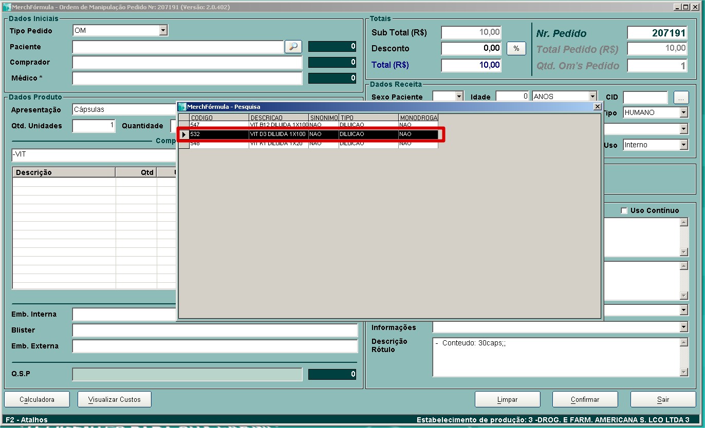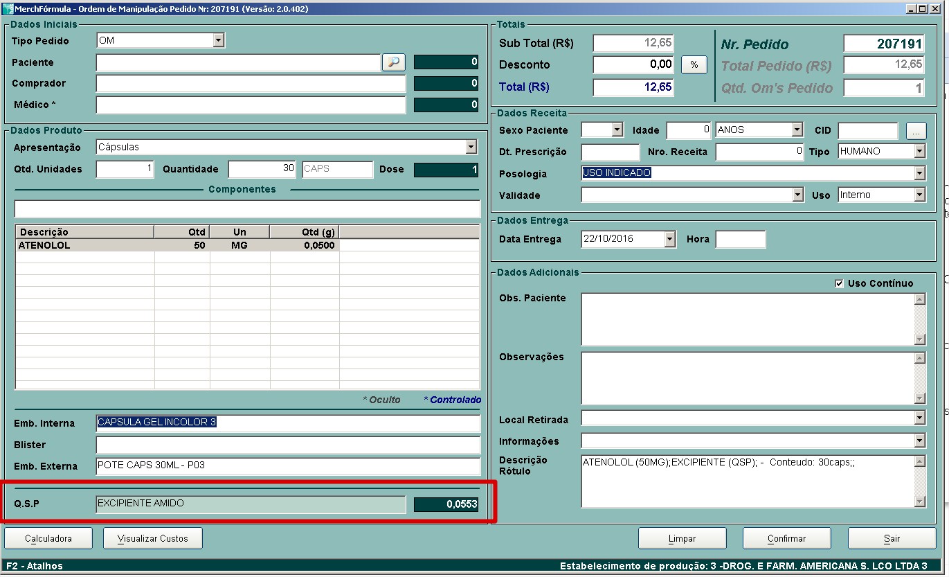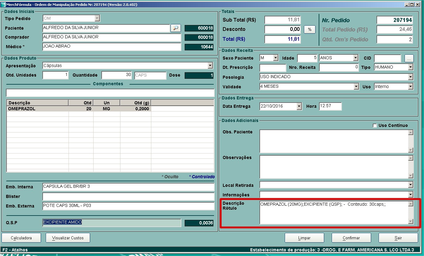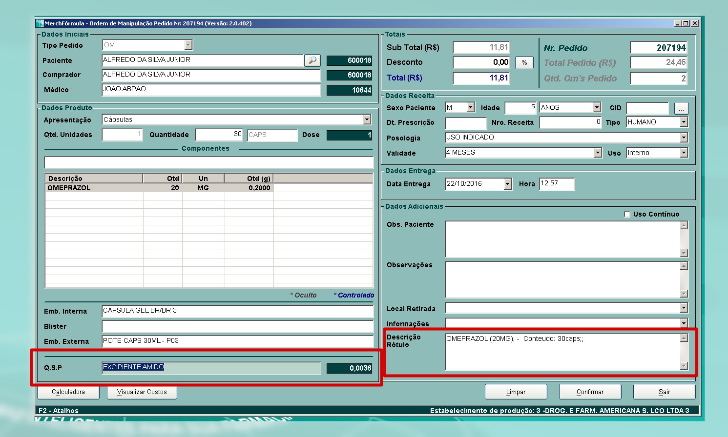 6. Foi incluída a funcionalidade de retirar um produto do rótulo. Por exemplo, observe o pedido do Omeprazol. Desejo retirar o excipiente QSP do rótulo. É só ir no campo do QSP e pressionar F12. Observe as imagens: