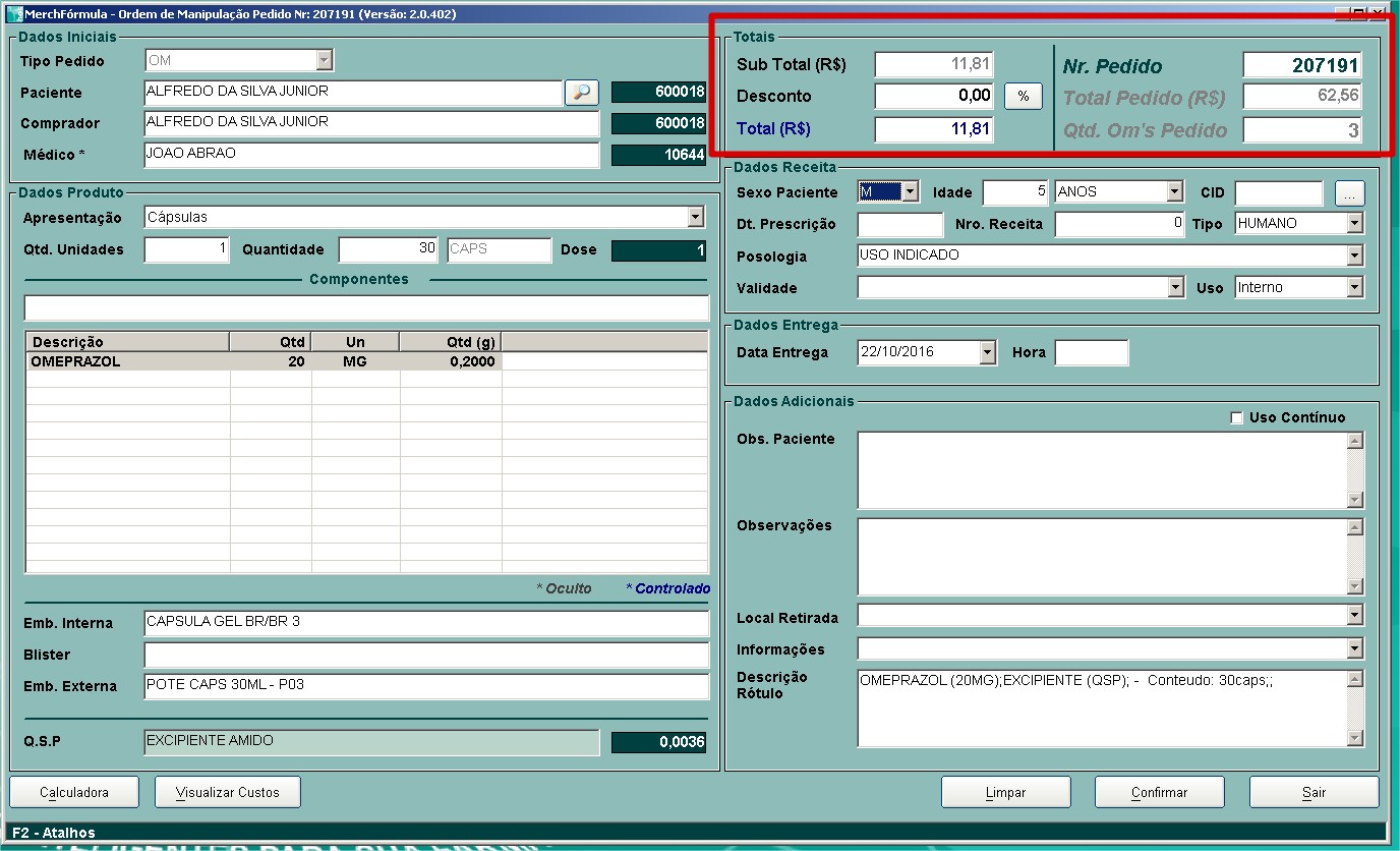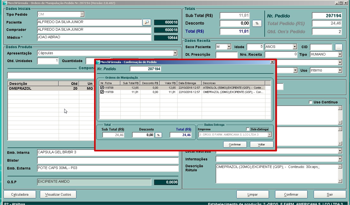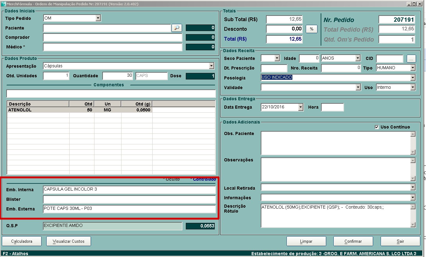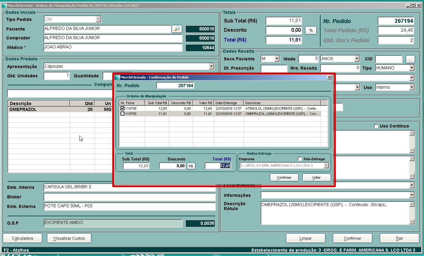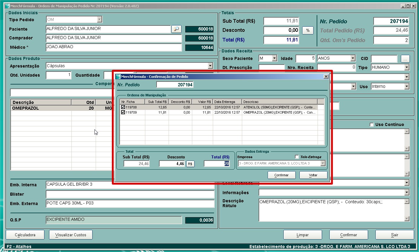6. Foi incluída a funcionalidade de retirar um produto do rótulo. Por exemplo, observe o pedido do Omeprazol. Desejo retirar o excipiente QSP do rótulo. É só ir no campo do QSP e pressionar F12. Observe as imagens: