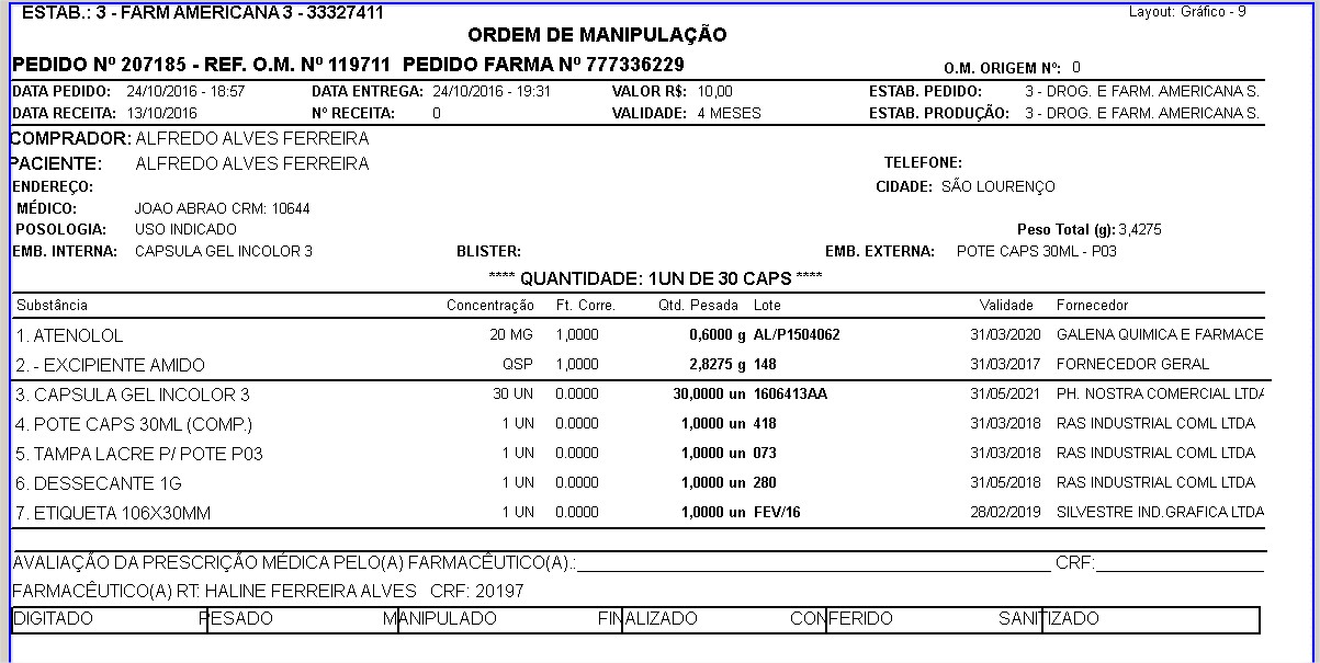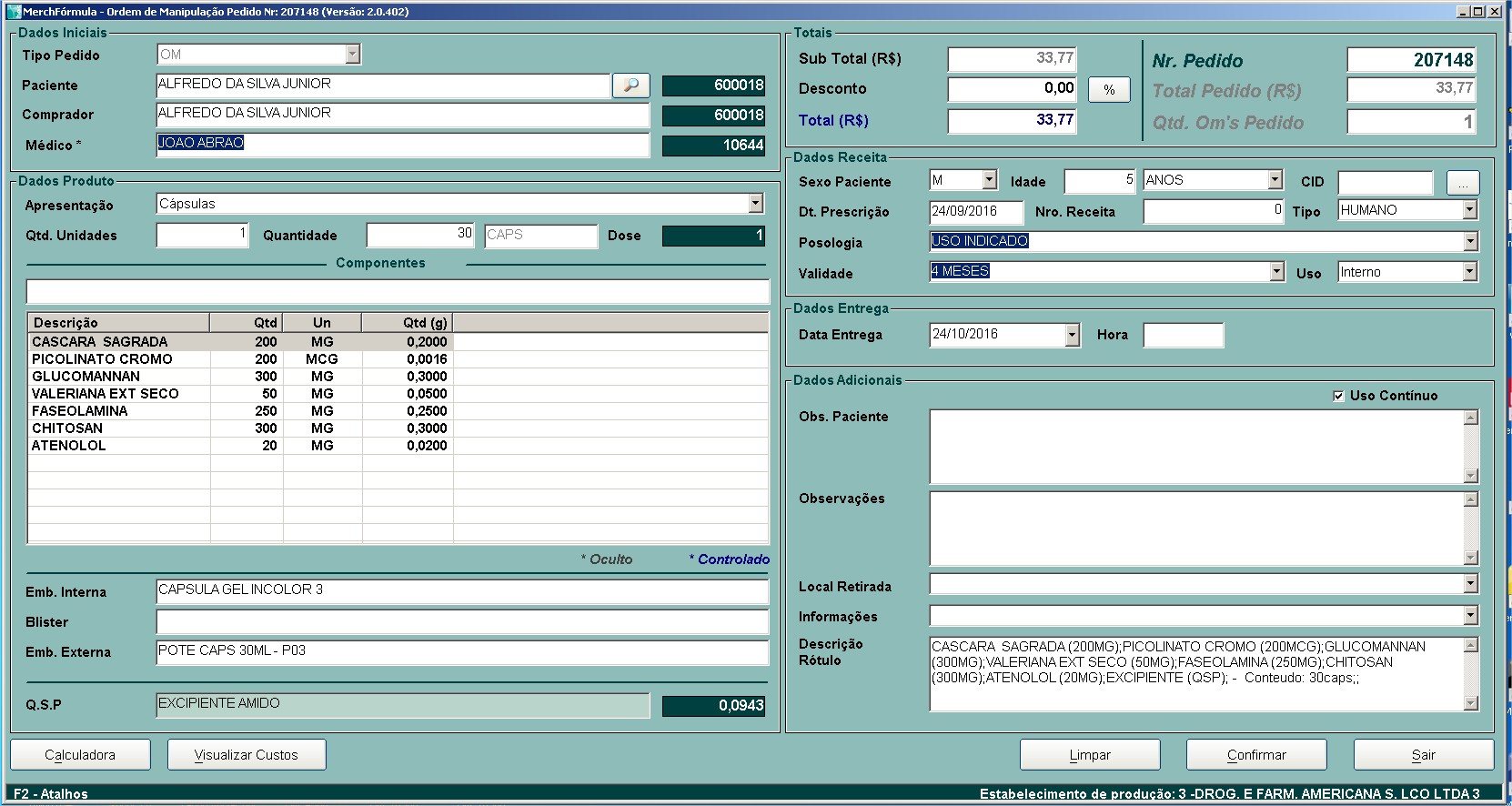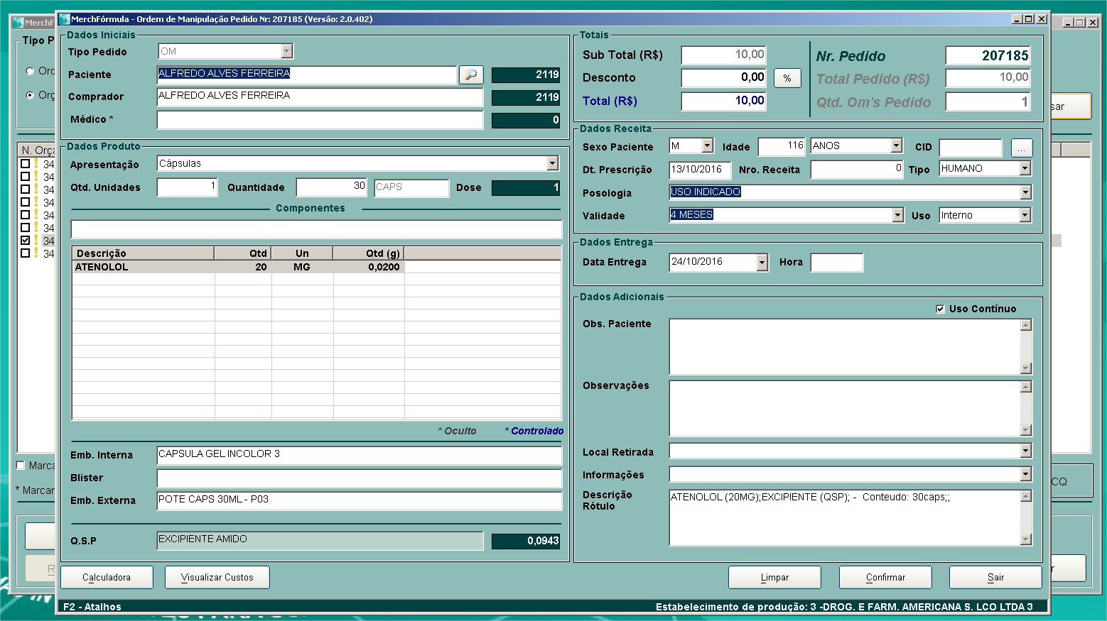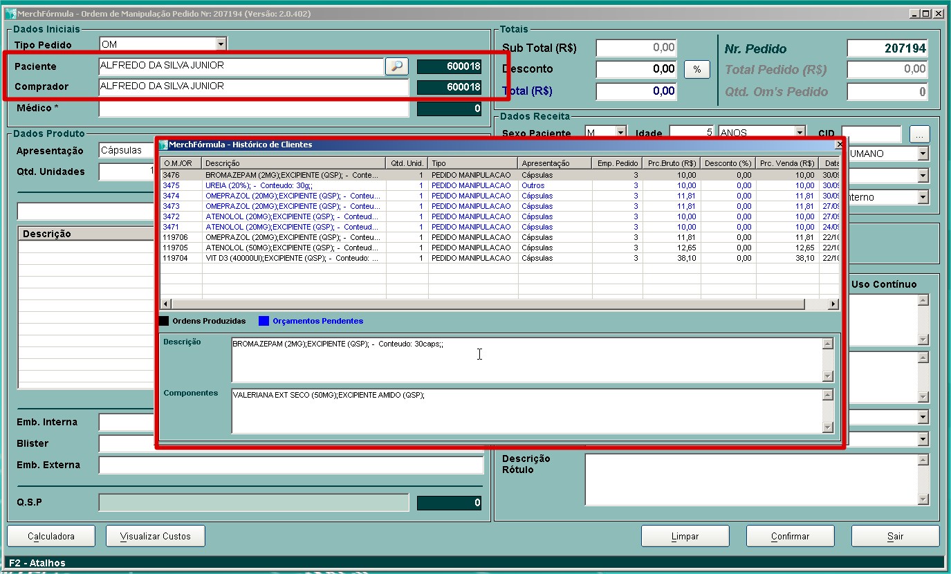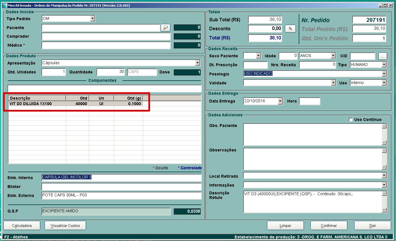 6. Foi incluída a funcionalidade de retirar um produto do rótulo. Por exemplo, observe o pedido do Omeprazol. Desejo retirar o excipiente QSP do rótulo. É só ir no campo do QSP e pressionar F12. Observe as imagens: