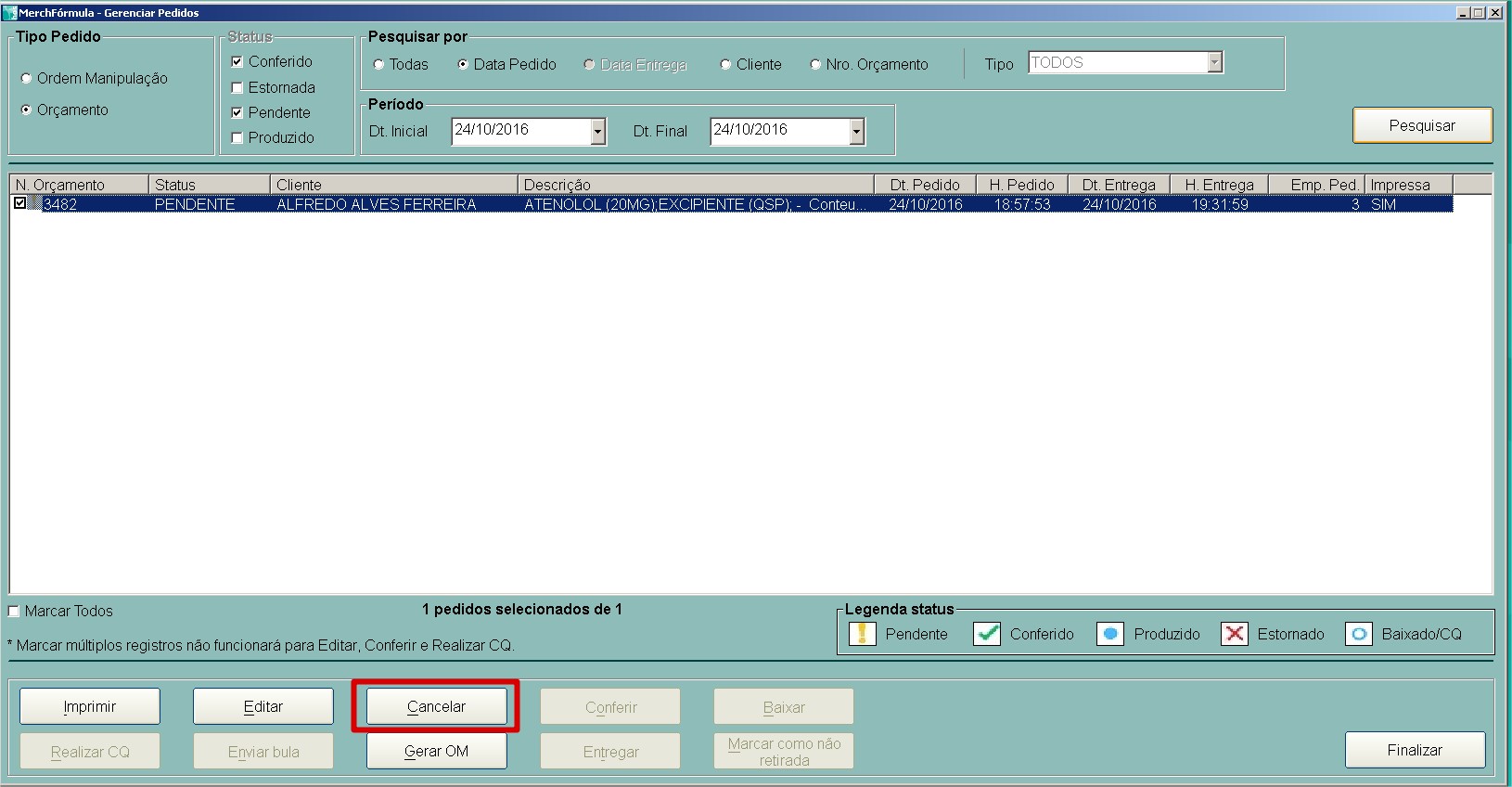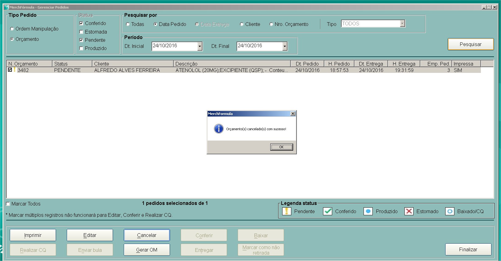 Nessa tela também é possível cancelar uma OM/Orçamento que o cliente não queira mais. Nesse caso, é só deixar a OM desmarcada. No nosso exemplo, vamos supor que o cliente desistiu do Omeprazol.