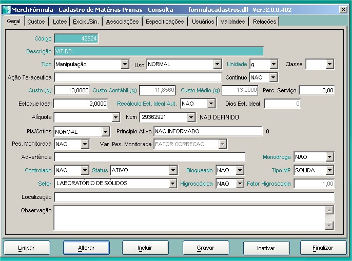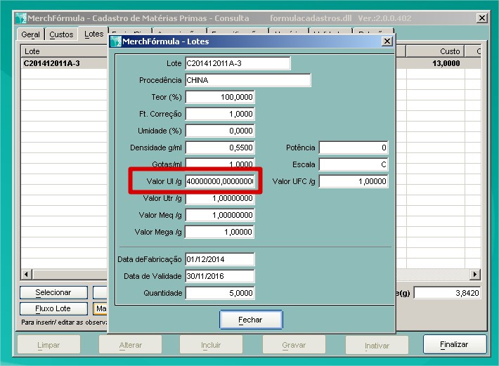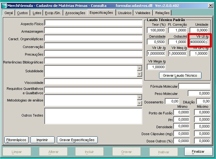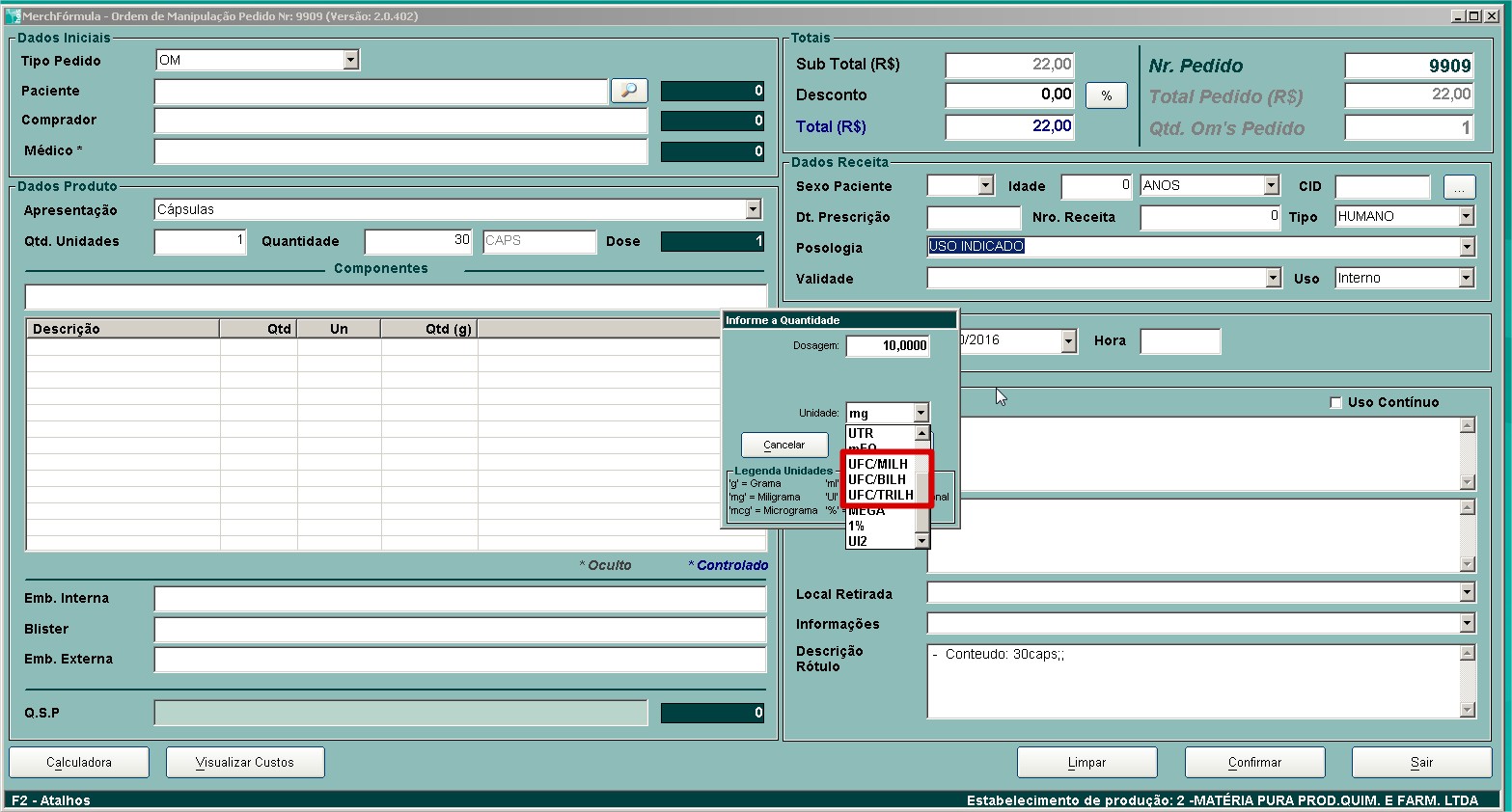 9. Com a nova rotina de Orçamento/OM foram alteradas as conversões das unidades especias de MG para G. Antes o sistema solicitava que o operador cadastrasse as conversões de UI/MG, UTR/MG, Meq/MG, etc. Dessa forma estava um pouco fora do padrão do mercado, já que os laudos dos fornecedores vinham em sua maioria com as conversões em G (UI/G) por exemplo. A própria atualização do sistema já fará a conversão automaticamente.
