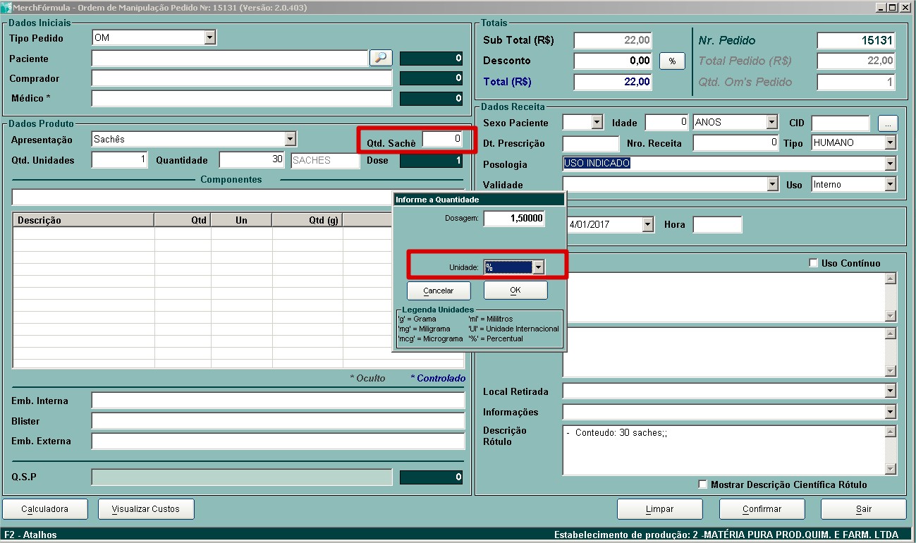 Quando o insumo for inserido com a unidade %, o operador obrigatoriamente deverá colocar o volume do Sachê, pois para calcular o QSP o sistema deve saber qual o volume deverá ser utilizado.