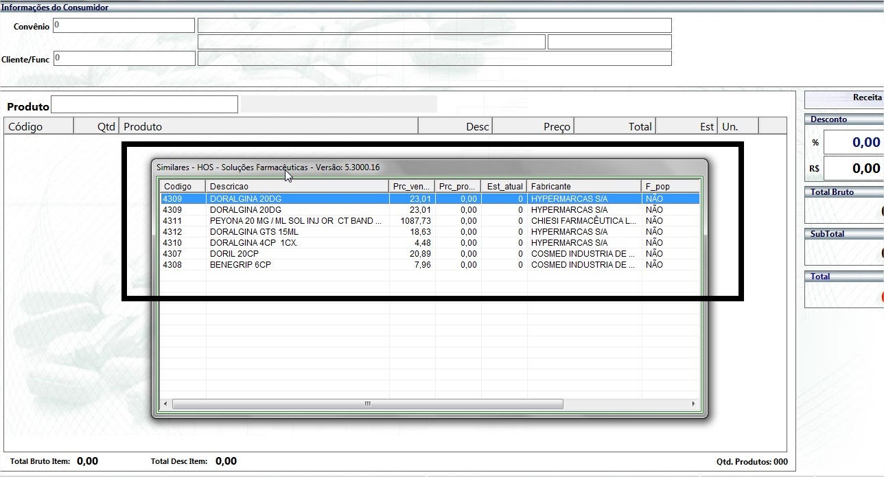 3 - No momento da venda ou orçamento, quando o produto for identificado será exibida uma tela informando os produtos similares, assim é possível ofertar/optar pelo produto identificado ou um similar, conforme desejo do paciente da Farmácia.