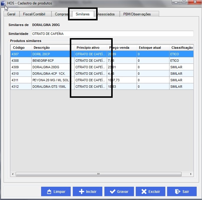 Caminho: HOSFarma -> Cadastro -> Produtos -> Similaridade