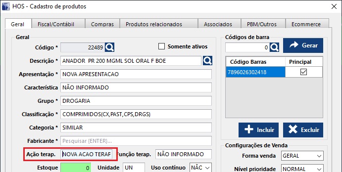 A Ação Terapêutica pode ser vista no cadastro de produtos como no exemplo abaixo. Ela pode ser utilizada também como campo de pesquisa.