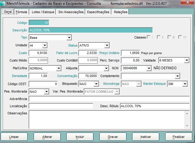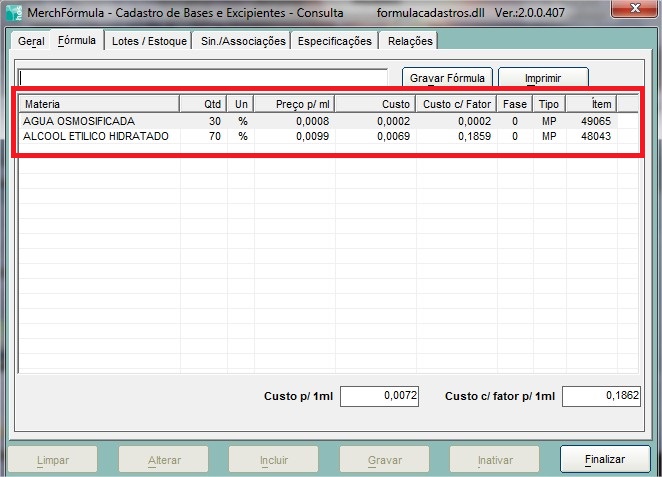 OBS: A Quantidade definida será removida dos itens que compõe a fórmula.