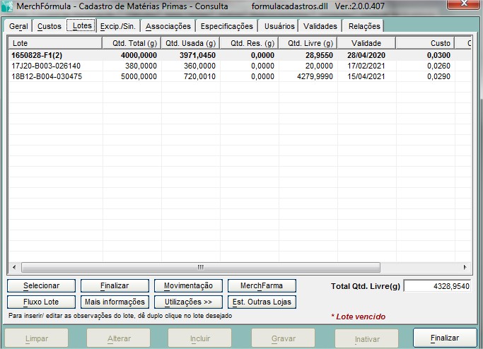 Nesta aba é possível verificar os Lotes referente as MP, bem como suas respectivas Quantidades.