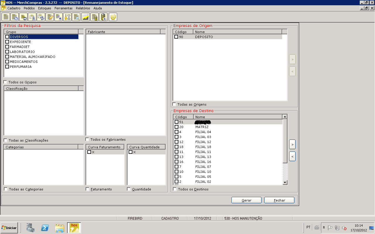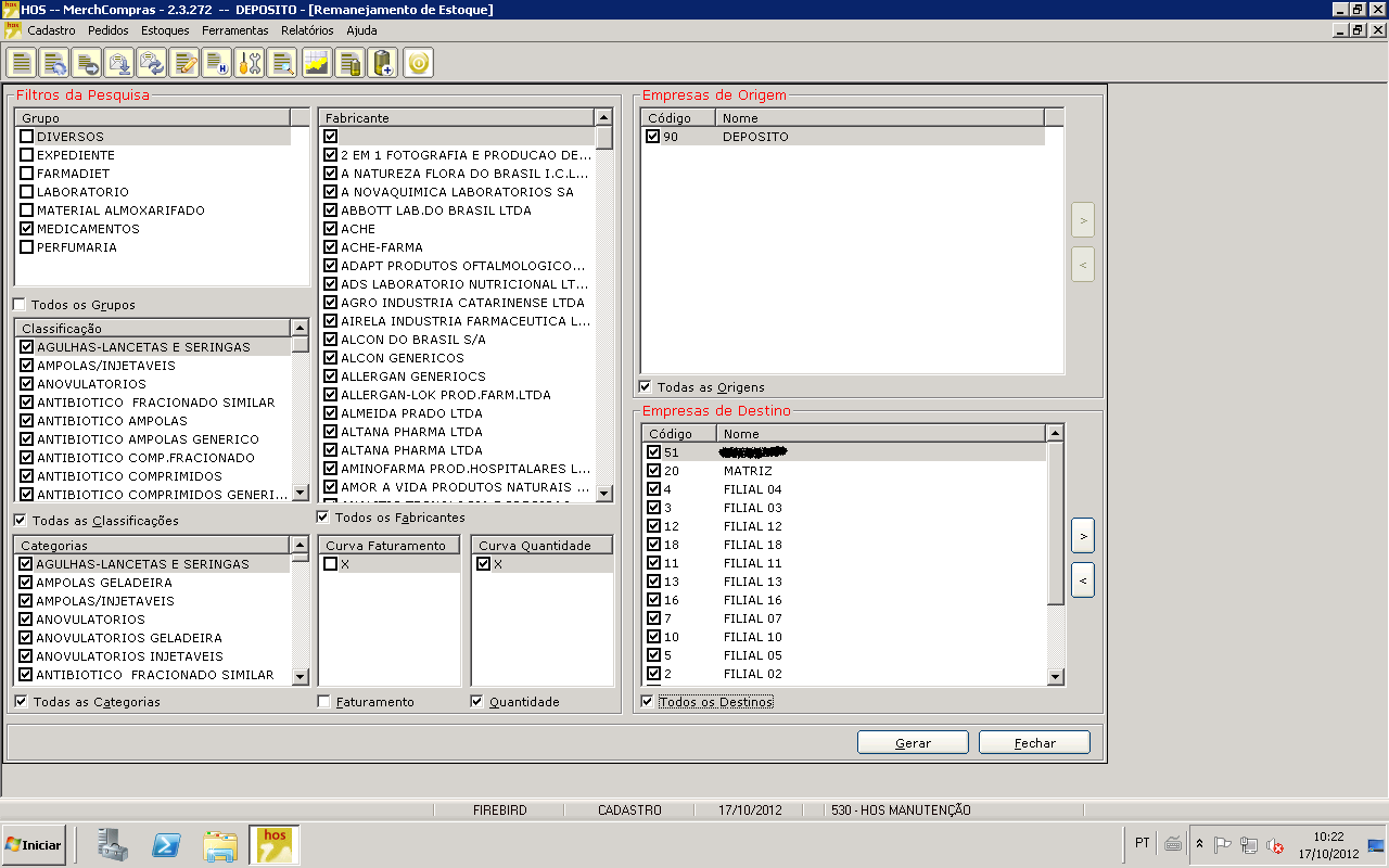 3º Passo) agora iremos montar o nosso remanejamento. Para este exemplo, realizaremos apenas a transferência de produtos do grupo de Medicamentos. Assim, selecionaremos o grupo "Medicamentos", todas as classificações, todas categorias e todos fabricantes. Transferiremos da origem depósito (se houver mais de uma origem cadastrada, é aqui que o usuário poderá definir se quiser transferir entre filiais), para todas as lojas. Repare que as lojas que estão cadastradas como destino, estão já na sua ordem de transferência que foi cadastrada no 1º passo.