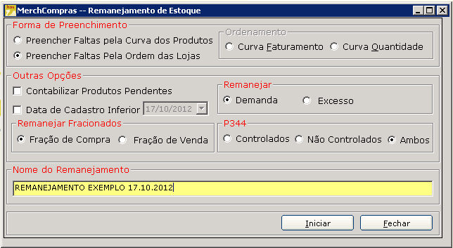 - Remanejar Fracionados: se é para remanejar pela fração de compra (caixa) ou pela fração de venda (cadastro do produto).