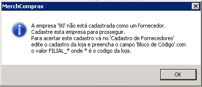 OBS²: a empresa 'Origem' deve estar cadastrada como um fornecedor. Neste caso, a empresa 90 também deve ser cadastrada como Depósito. Se não, após o 4º passo aparecerá a mensagem abaixo.