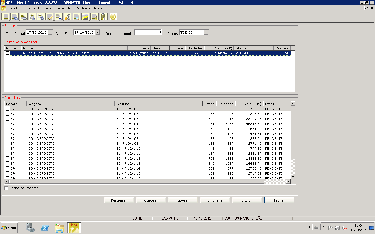 A regra de negócio aqui apresentada é a seguinte: teremos um centro de distribuição de mercadorias (CD) e diversas filiais para serem atendidas. Ou seja, o remanejamento sairá a partir do CD e irá atender as filiais.