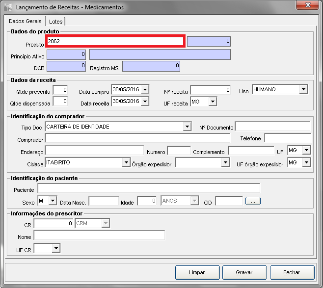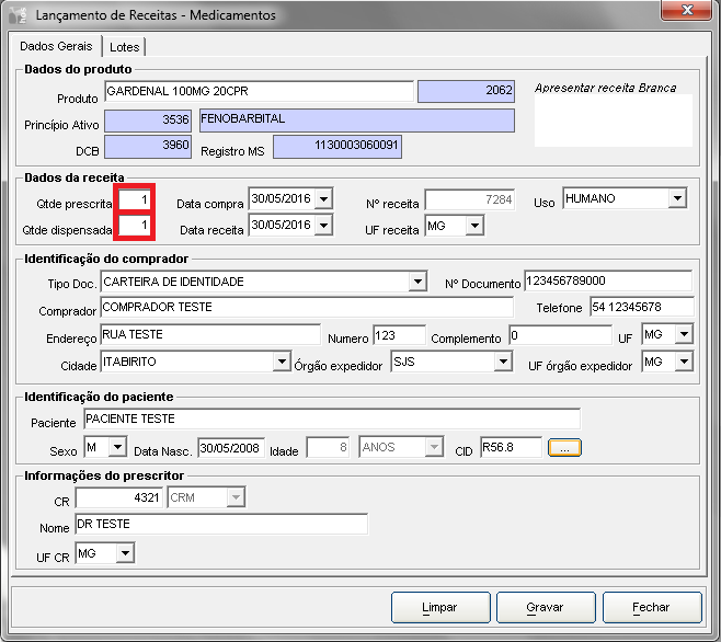 Os dados do produto cujo código digitado se refere, completarão os campos restantes dos Dados do produto. Os Dados da receita, Identificação do comprador, Identificação do paciente e Informações do prescritor terão de ser preenchidos conforme o caso. Dê uma atenção especial à Qtde prescrita e a Qtde dispensada. A quantidade prescrita é a que foi receitada pelo médico e ela pode ser maior do que a dispensada, que é a que está sendo vendida. Caso ambas as quantidades sejam as mesmas, a receita poderá ser utilizada apenas uma vez.