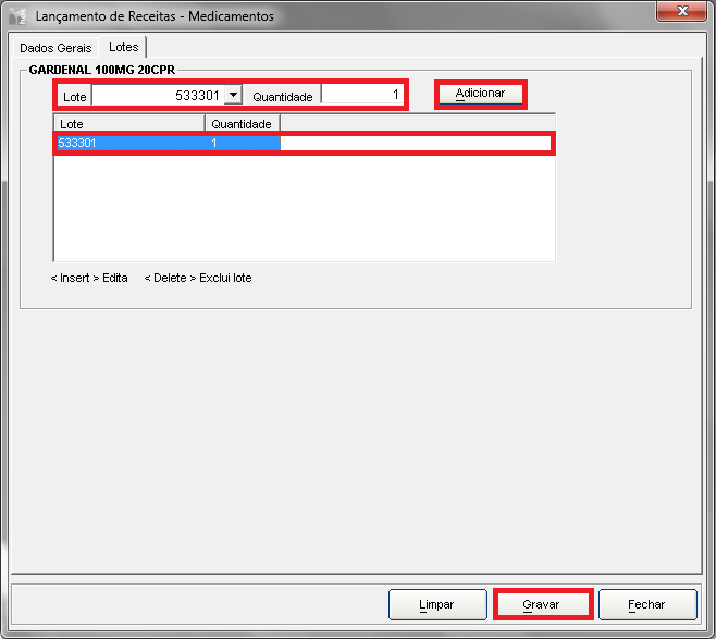 Mude para a aba Lotes, selecione o Lote, a Quantidade e clique em Adicionar. O lote será incluído na lista abaixo. Clique em Gravar.