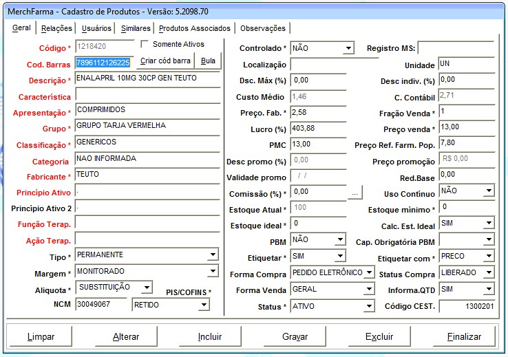 No Cadastro de Produtos, no campo Preço.Ref.Farm.Pop serve como um preço de venda para os produtos pertencentes ao Farmácia Popular. Por exemplo, vamos observar o produto Mesigyna.