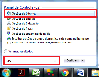 2 - Agora clique novamente no botão windows e busque por “Opções de Internet”.