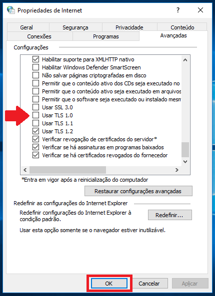 Agora feche todos os navegadores e abra novamente a Opções de internet, vá novamente na aba “Avançado”, desça a barra de rolagem até o final, desmarque as opções SSL 3.0, TLS 1.0 e TLS 1.1, deixe apenas selecionado TLS 1.2 e clique em OK.