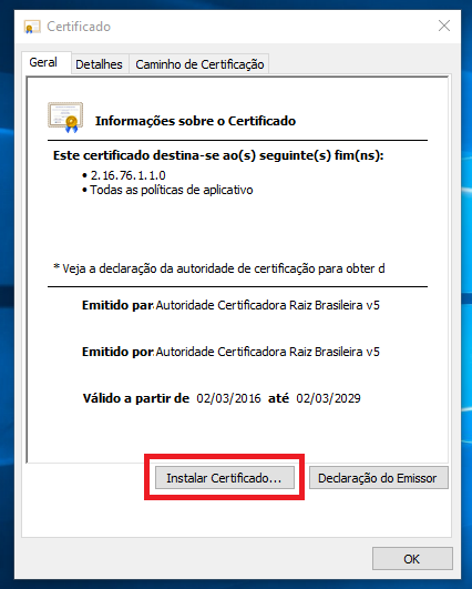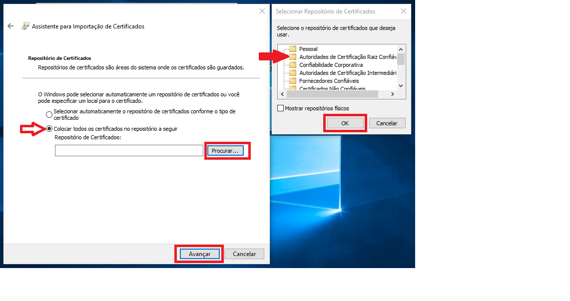 Agora clique em “Avançar” e selecione “Colocar todos os Certificados no repositório a seguir”, depois clique em Procurar e selecione “Autoridade de Certificação Raiz Confiáveis” clique em OK e em Avançar novamente e por fim clique em OK