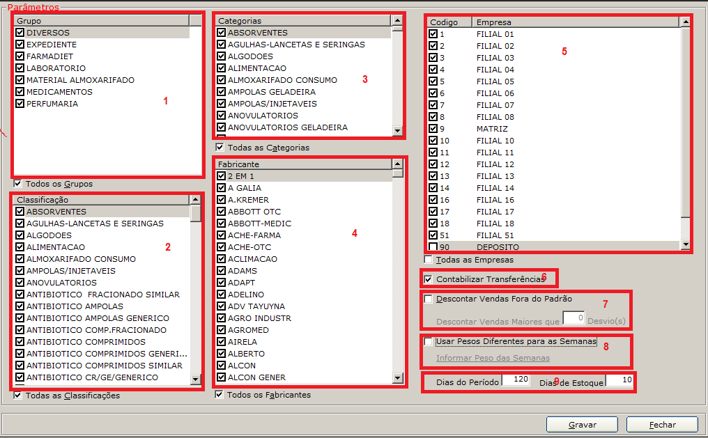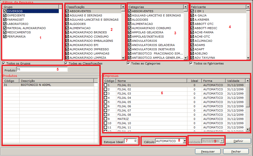 1. Grupos: seleção de quais grupos de produtos que obedecerão a regra para o cálcullo do estoque ideal.