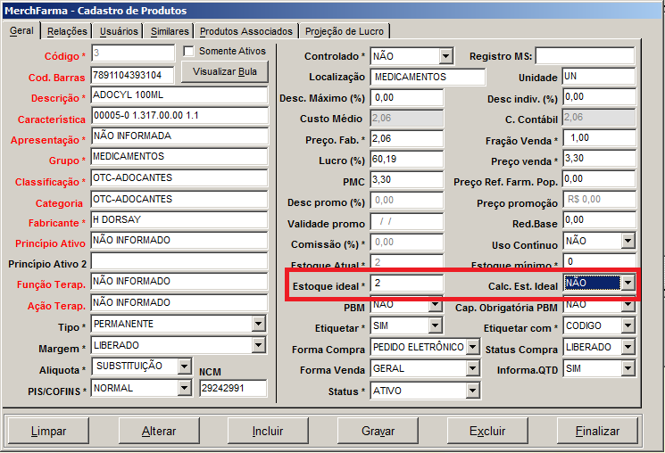 Calc. Est. Ideal: neste campo, o usuário irá informar se é para que o sistema calcule seu estoque atual 'SIM' ou 'NÃO'.