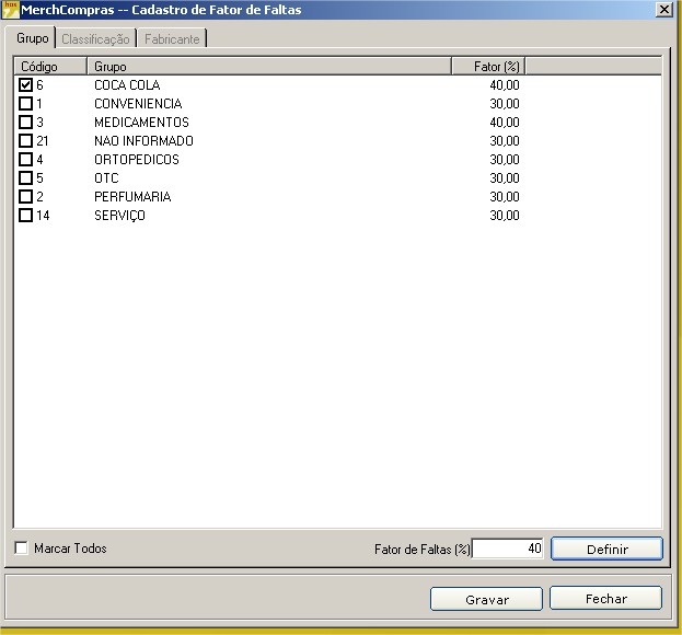 Para o caso do Tipo de Fator de Faltas se por Grupo, Classificação ou Fabricante, será necessário fazer o cadastro do mesmo para a determinada configuração escolhida.