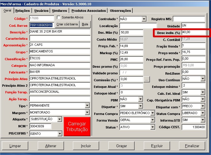Com isso, o sistema identificará qual o maior desconto e concederá o mesmo. No nosso exemplo, os 40%.