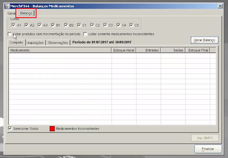 Ao acessar a aba Balanço, é possível gerar as movimentações utilizando os filtros disponíveis. Só serão escriturados os produtos do controle especial, esta regra de geração do balanço não se aplica aos produtos antimicrobianos.