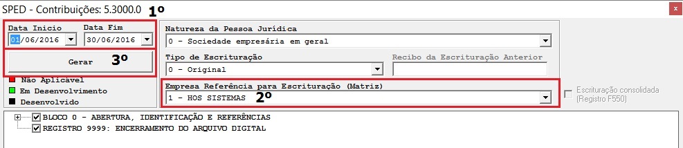 2. Verificar o período do arquivo se está correto; Selecionar a empresa Matriz e clicar em Gerar: