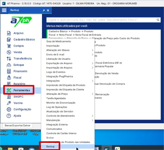 1. No sistema Alpha7 acessar o menu Ferramentas > Backup.