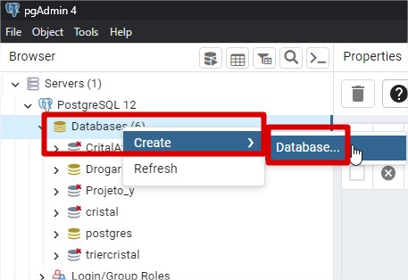 2. Abrir o PostgreSQL, entrar com seu usuário e criar uma nova database utilizando o botão direito do mouse.
