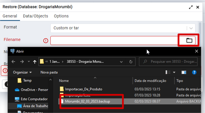 2.3 Na janela que aparecer, no campo "Filename", selecionar o arquivo Backup que você salvou do cliente.