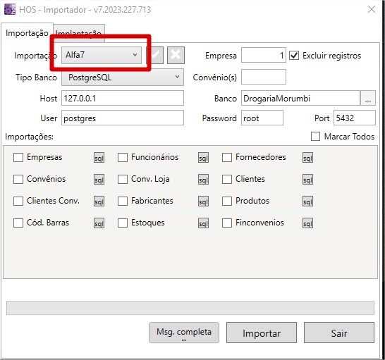 3. Com o importador aberto, selecione o campo Importação, escolha a opção "Alpha7" e coloque o mesmo nome da database.