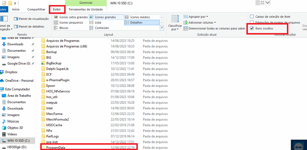 Para localizar esta pasta no servidor do cliente, habilite a opção do Windows Explorer de Visualizar Itens Ocultos
