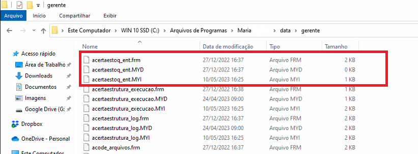Localizando o BD, certifique-se que este é o banco de dados que está sendo utilizado pelo BIG. Ordene os arquivos por data e verifique se constam os 3 tipos de arquivos (veja a imagem abaixo).