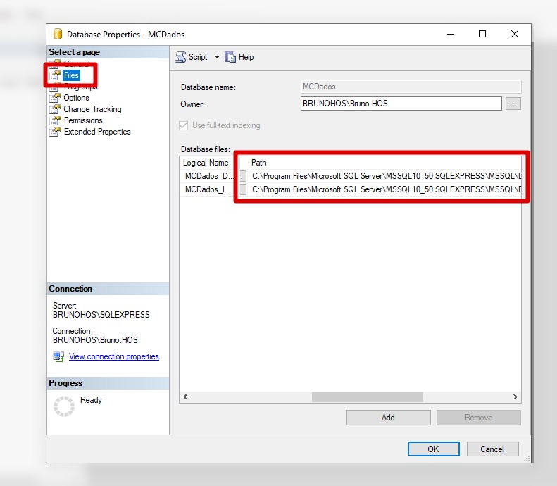 - Click No 'File' ou 'Arquivos' (dependendo a versão do SSMS) irá ter o caminho do banco