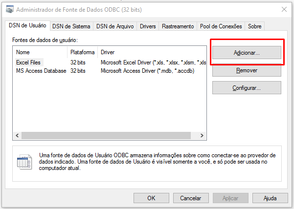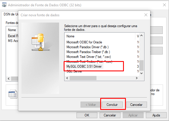 *Em DNS será inserido o mesmo nome informado em "Data Source Name", informado na criação do ODBC.