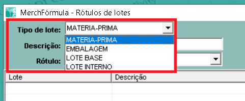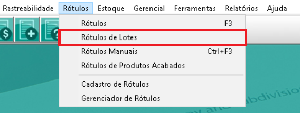 Na opção Rótulos >> Rótulos de Lotes, podemos imprimir as etiquetas de Matérias primas, Embalagens, Lote Interno de Bases ou Excipiente e Lote Interno de Fórmulas.