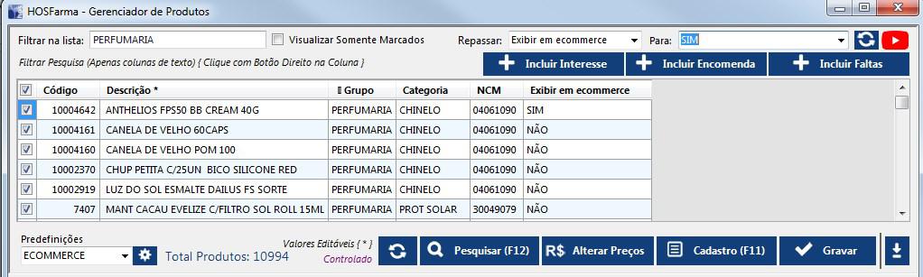 O cliente poderá realizar a manutenção dos produtos para o E-commerce através do Cadastro de Produtos, aba "Ecommerce" ou utilizar o Gerenciador de Produtos. É muito importante realizar esta revisão/manutenção, tendo em vista que a descrição, classificação, grupo e preço de venda que se encontra aba "E-commerce", será exibida no aplicativo. Abaixo, segue imagem onde habilitamos uma determinada classificação de produtos para ser utilizada no Ecommerce utilizando o Gerenciador de Produtos e alterando o campo "Exibir em Ecommerce" para "SIM".