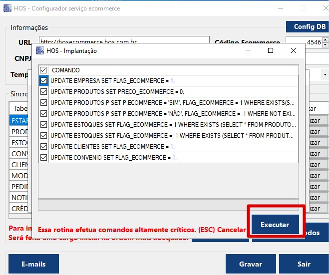 O Botão "Implantação", é necessário utilizar na primeira vez em que a configuração é realizada. Ao acessar o mesmo, marcar todas as SQL a serem executadas e pressionar o Executar.