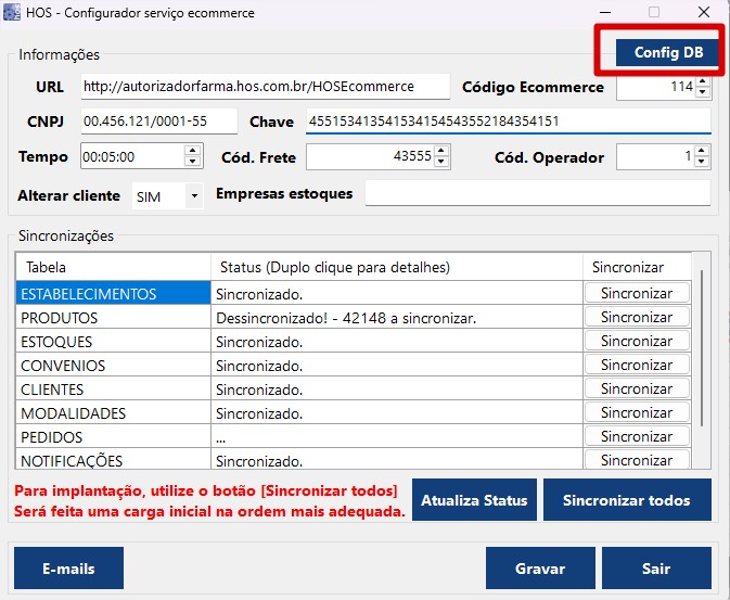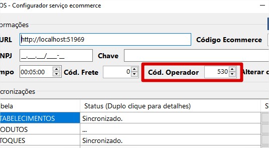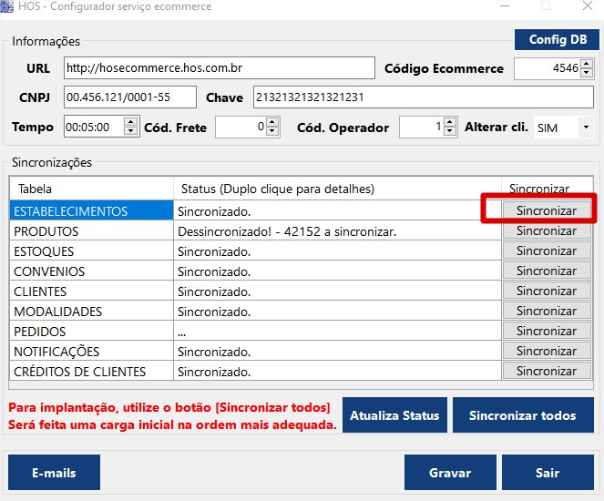 Após, realizar a sincronização dos dados, no configurador. Pressionar o botão "Sincronizar" em cada um dos itens, realizar um de cada vez iniciando por ESTABELECIMENTO e no fina gravar;