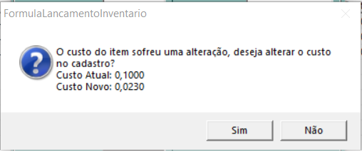 Caso o item tenho sofrido alteração no custo, o sistema irá mostrar o alerta abaixo. Se optar por atualizar o custo (SIM) o sistema altera o custo no cadastro.