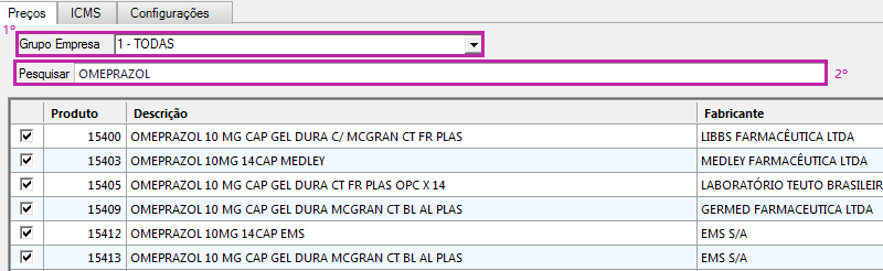 No Grupo Empresa, selecionar a empresa que receberá a alteração de preços. No campo pesquisar pode ser realizado o filtro pela descrição.