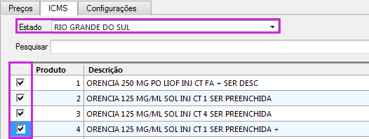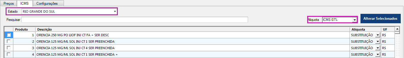 3 - Na aba ICMS, podemos selecionar o Estado, marcar os itens e informar a alteração de Alíquota: