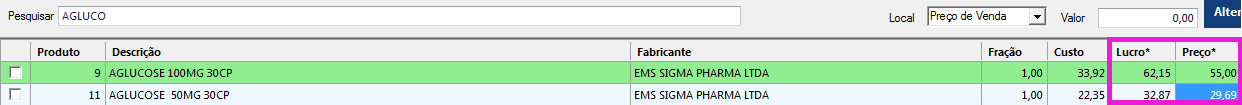 As colunas Lucro, Preço e Desc. Indiv podem ser alteradas na própria tela, pois são campos Editáveis (*)