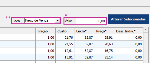 Ou o repasse pode ser realizado para vários produtos ao mesmo tempo. Para isso, marcar os produtos que serão alterados, no campo Local deixar como Preço de Venda no Valor, informar o novo Preço de Venda e depois clicar em Alterar Selecionados