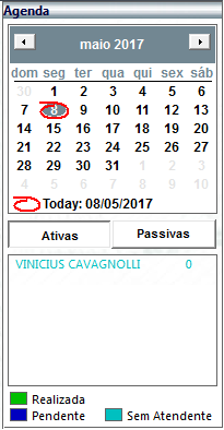Na seção da agenda, é possível selecionar a data através do calendário na parte superior, e ainda filtrar por tipo de atendimento (Ativo / Passivo). Os atendimentos em Verde que aparecerem já estão concluídos, em Azul, Pendentes de realização, e em Verde-Água, os que estão sem atendente associado.