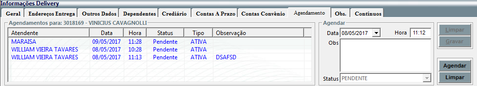 agendamentos existentes para o cliente, mostrando quem atendeu, quando atendeu