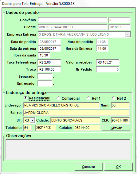 Tele Entrega. Onde é possível revisar endereço de entrega, apontar observações,