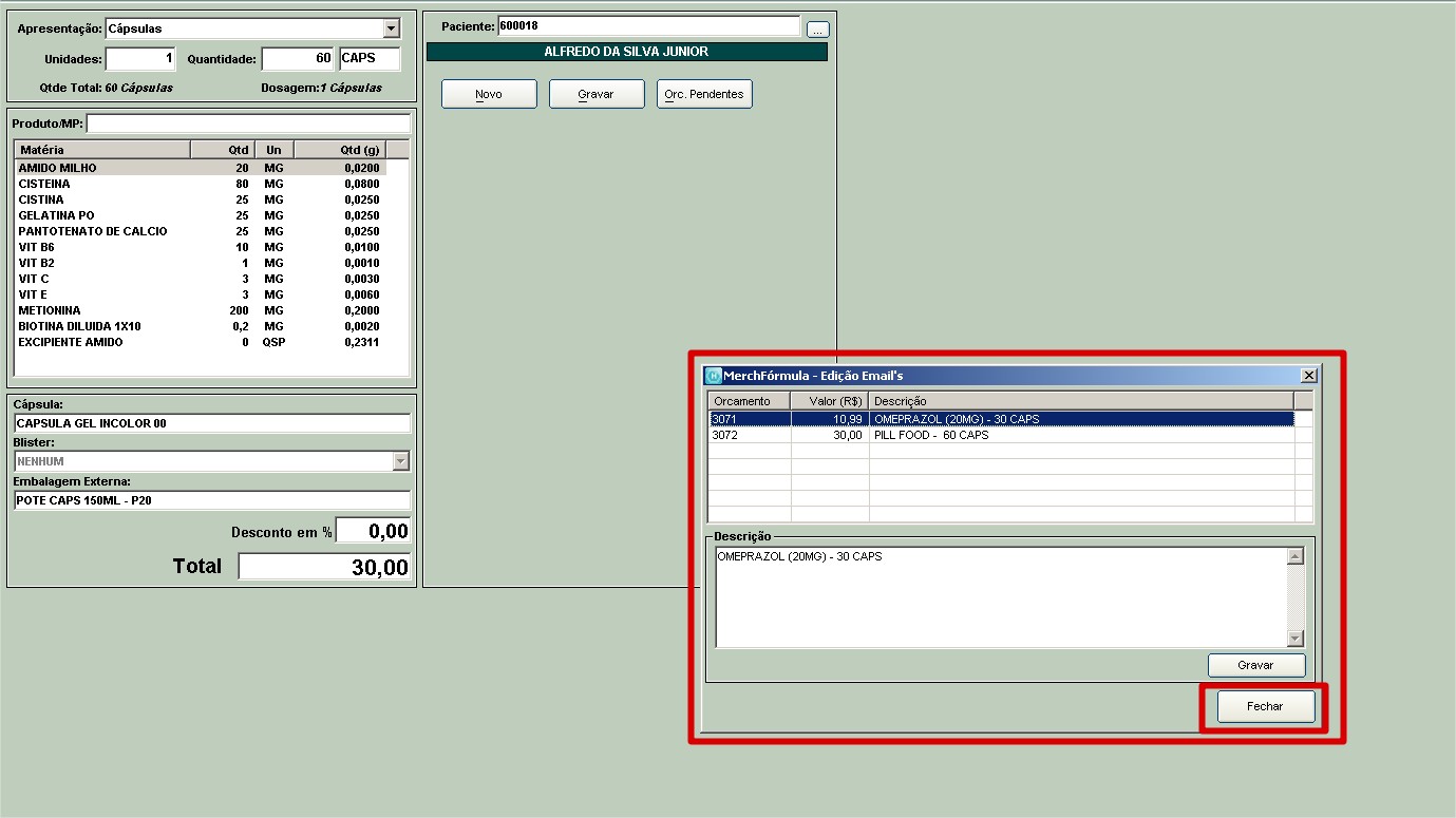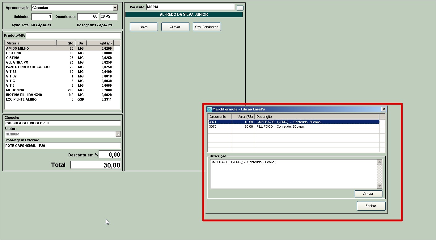 3. A receita e orçamento utilizados no exemplo acima são totalmente ilustrativos, a receita anexada não é correspondente ao que foi solicitado no texto do email e também no email foram solicitadas 60 cápsulas de Omeprazol, porém no orçamento foram 30 cápsulas, logo é o operador que deve digitar corretamente as quantidades solicitadas no orçamento.