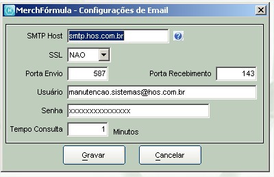 O Email acima é o que a farmácia recebe as solicitações de orçamentos de fórmulas. Atentar para o campo Tempo Consulta, é o tempo que o sistema verificará se um novo email chegou no endereço configurado.